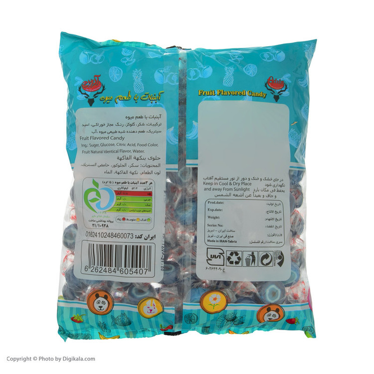 ارزش غذایی هر سه عدد آبنبات با طعم میوه (15گرم) : انرژی: 53.4 کیلوکالری قند: 11.8 گرم چربی: 0 گرم نمک: 0 گرم اسیدهای چرب ترانس: 0 گرم
