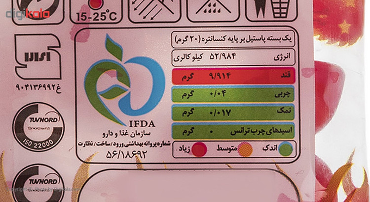 پاستیل میوهای مدل «Dragon Ball» یکی دیگر از تولیدات خوشمزه و خاص برند «شیبا» است که با طعم شیرین و شکل جذابش، یکی از پرطرفدارترین تنقلات در میان کودکان و حتی بزرگسالان محسوب میشود. وجود ژلاتین در مواد اولیهی پاستیل موجب شده تا این مادهی غذایی لاستیکیشکل و نسبتا نرم باشد؛ بهاینترتیب در مقایسه با شکلاتها و آبنباتهای سفت، انتخابی بهتر است. ناگفته نماند که بعد از خوردن تنقلات شیرین و برای پیشگیری از پوسیدگی در دندانها، مسواکزدن امری ضروری است. همانطور که در تصاویر به چشم میخورد، پاستیل «شیبا» در یک بستهبندی پلاستیکی و در مقدار 90 گرم عرضه میشود. هرکدام از پاستیلهای کوچک داخل بستهبندی، رنگی و شیرین هستند و طعمی میوهای دارند. «شیبا» یکی از مشهورترین برندهای ایرانی است که با کمک فناوریهای نوین، محصولات متنوع و جذابی مانند شکلات، شیرینی، پاستیل، مارشملو و... تولید میکند. این محصولات از نظر طعم و کیفیت در سطح بسیار خوبی قرار دارند.