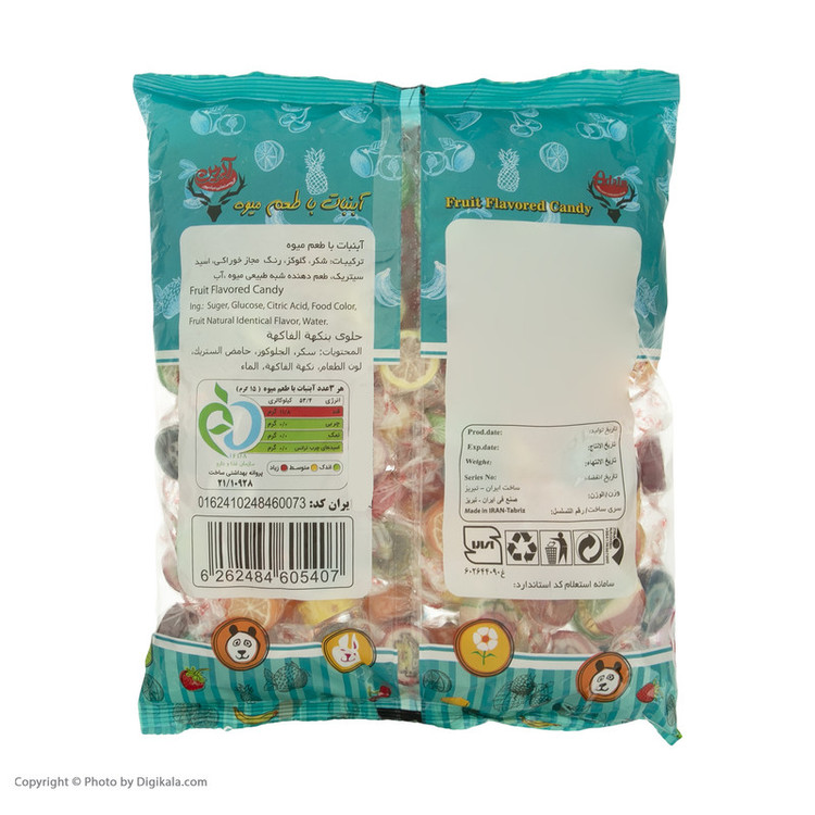 ارزش غذایی هر 3 عدد آبنبات با طعم میوه (15گرم) : انرژی: 53.4 کیلوکالری قند: 11.8 گرم چربی: 0 گرم نمک: 0 گرم اسیدهای چرب ترانس: 0 گرم