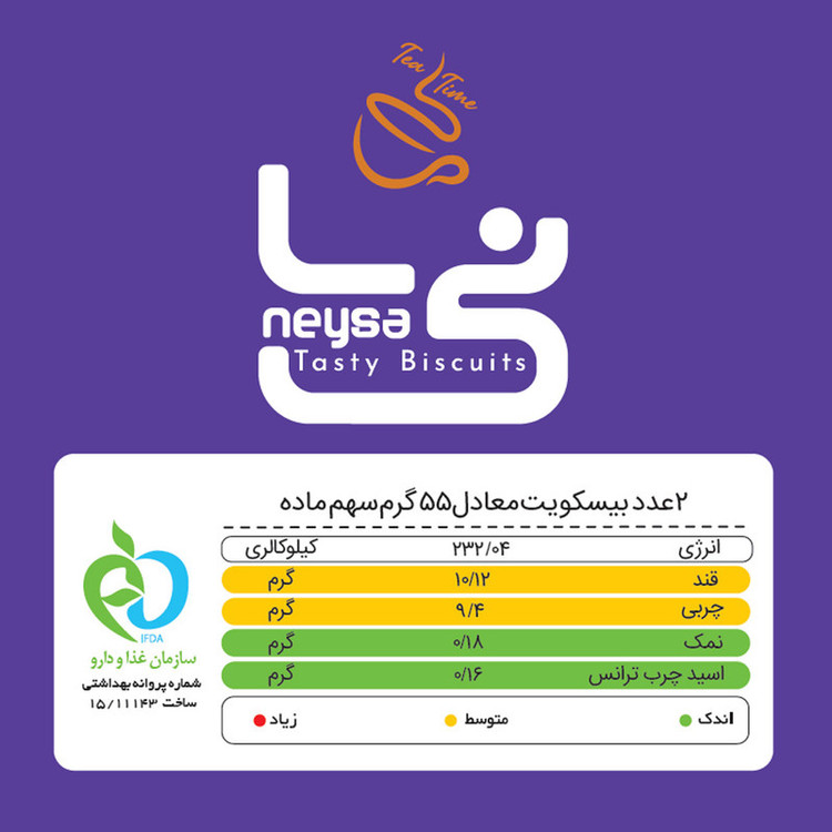 2 عدد بیسکویت معادل 55 گرم سهم ماده غذایی انرژی 232/04 کیلوکالری قند 10/12 گرم چربی 9/4 گرم نمک 0/18 گرم اسید چرب ترانس 0/16