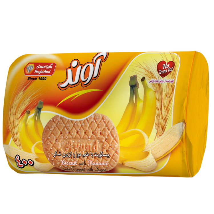 بیسکویت مدل 400 آوند تهیه شده از روغن بدون ترانس , با طعم موز و تزیین شکر تغذیه ای مقوی برای میان وعده های شما می باشد . طعم موز یکی از محبوب ترین طعم های این نوع بیسکویت است .