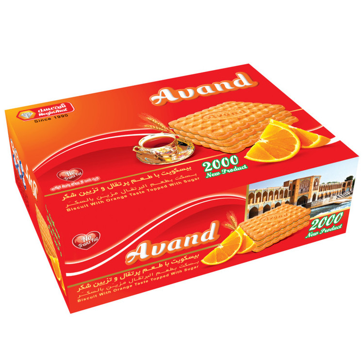 بیسکویت مدل 2000 آوند تهیه شده از روغن بدون ترانس , با طعم پرتقال و تزیین شکر مناسب استفاده در مهمانی ها و تغذیه ای مقوی برای میان وعده های شما می باشد . طعم پرتقال یکی از محبوب ترین طعم های این نوع بیسکویت است .