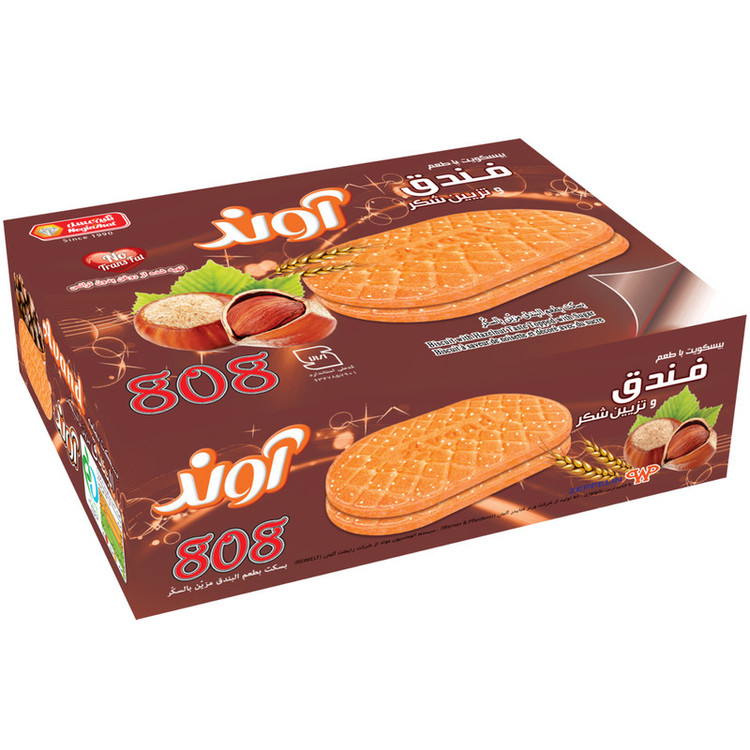 بیسکویت مدل 808 آوند تهیه شده از روغن بدون ترانس , با طعم فندق و تزیین شکر مناسب استفاده در مهمانی ها و تغذیه ای مقوی برای میان وعده های شما می باشد . طعم فندق یکی از محبوب ترین طعم های این نوع بیسکویت است .