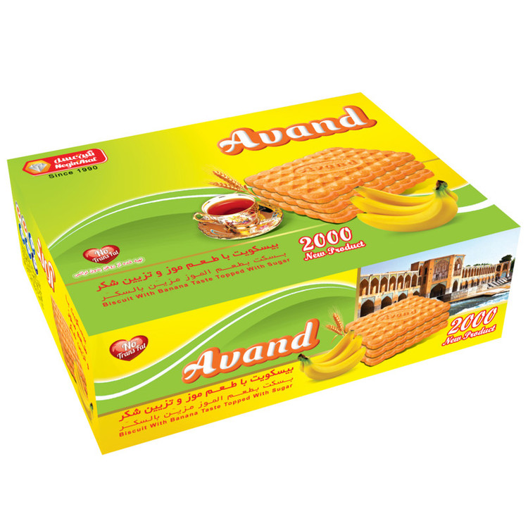 بیسکویت مدل 2000 آوند تهیه شده از روغن بدون ترانس , با طعم موز و تزیین شکر مناسب استفاده در مهمانی ها و تغذیه ای مقوی برای میان وعده های شما می باشد . طعم موز یکی از محبوب ترین طعم های این نوع بیسکویت است .