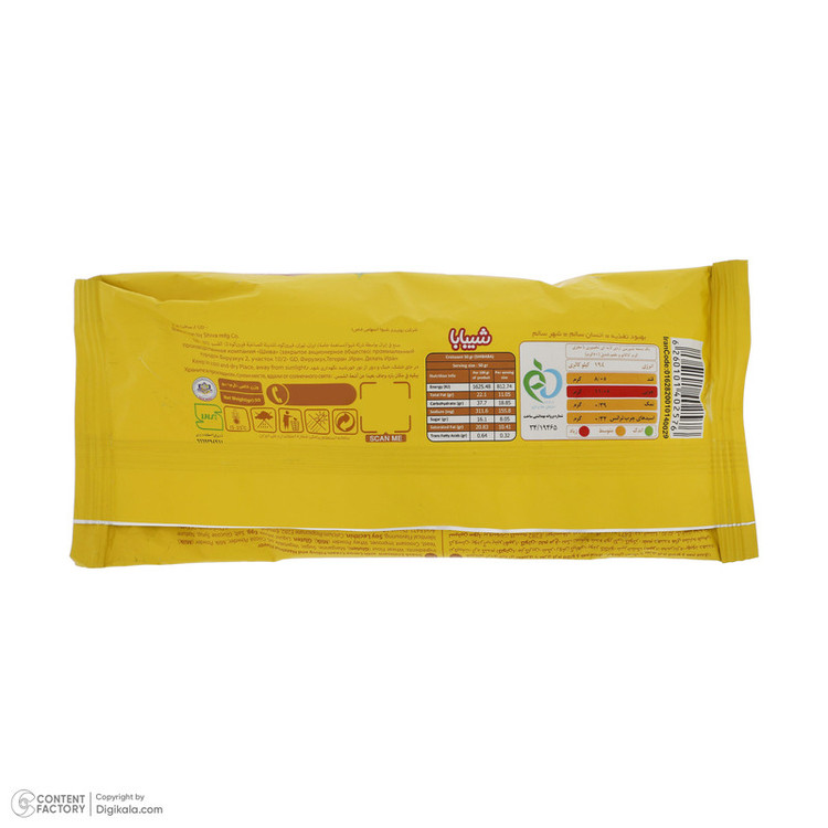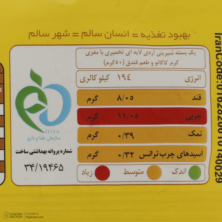 شیرینی آردی تخمیری با مغز کاکائو فندقی ارزش غذایی در هر 45 گرم: انرژی: 156 کیلوکالری قند: 9/67 گرم چربی:11.60 گرم نمک: 0.34 گرم اسیدهای چرب ترانس: 0.24 گرم