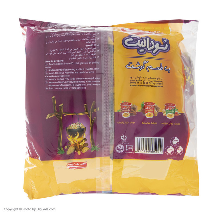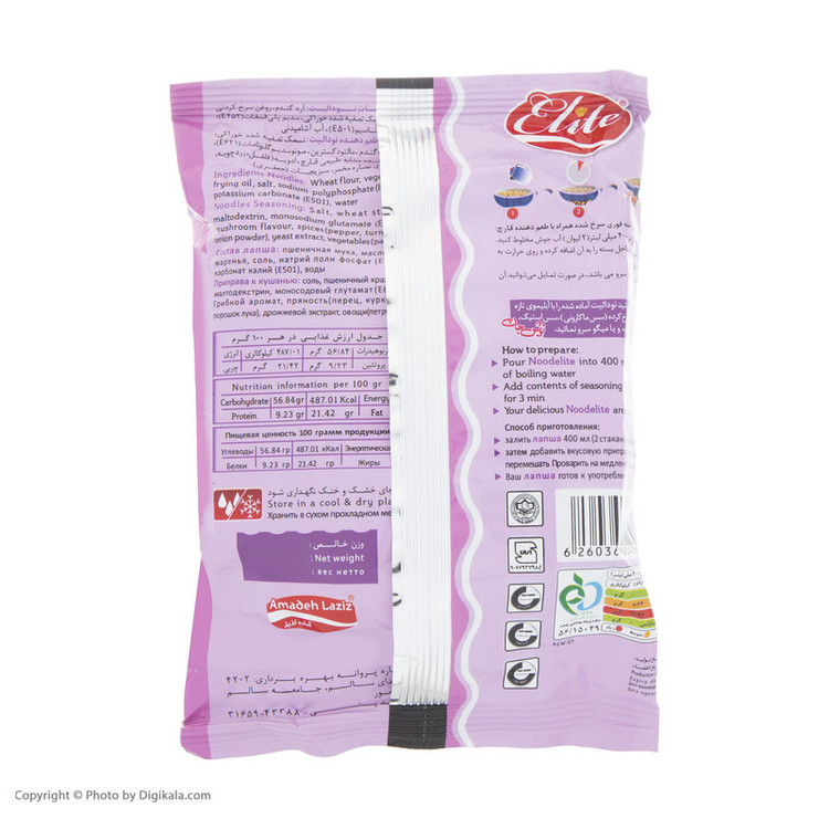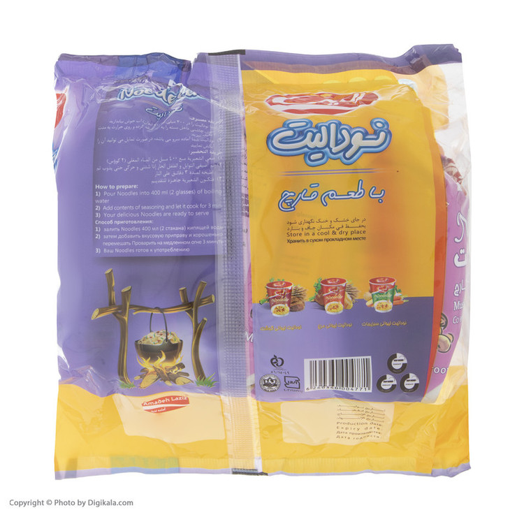 ارزش غذایی محصول در هر 100 گرم: - انرژی: 486/8 کیلوکالری - چربی: 21/42 گرم - کربوهیدرات: 57/42 گرم - پروتئین: 9/49 گرم - پک دارای عصاره گوشت و قارچ