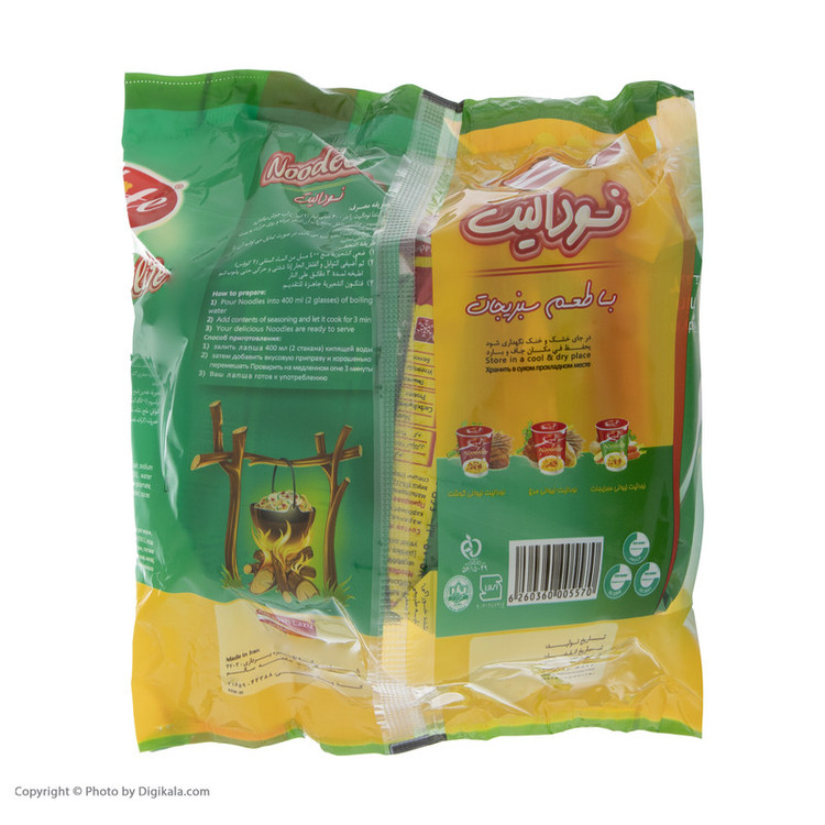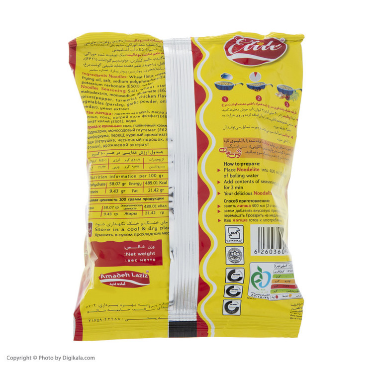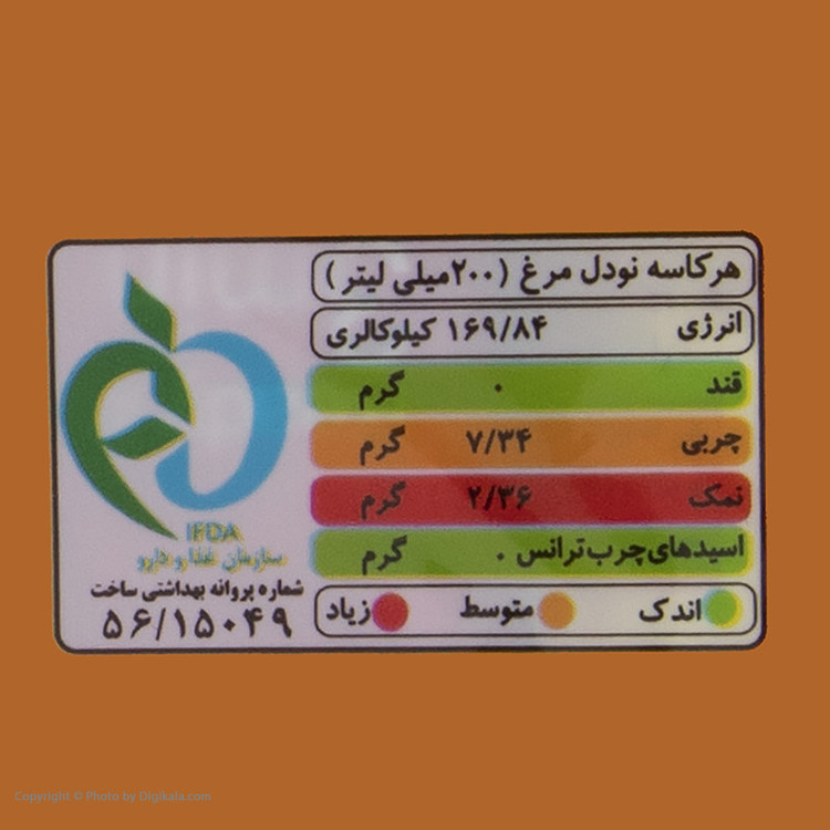 ارزش غذایی محصول در هر 100 گرم: - انرژی: 489/01 کیلوکالری - چربی: 21/42 گرم - کربوهیدرات: 58/07 گرم - پروتئین: 9/43 گرم - پک دارای عصاره مرغ و سبزیجات