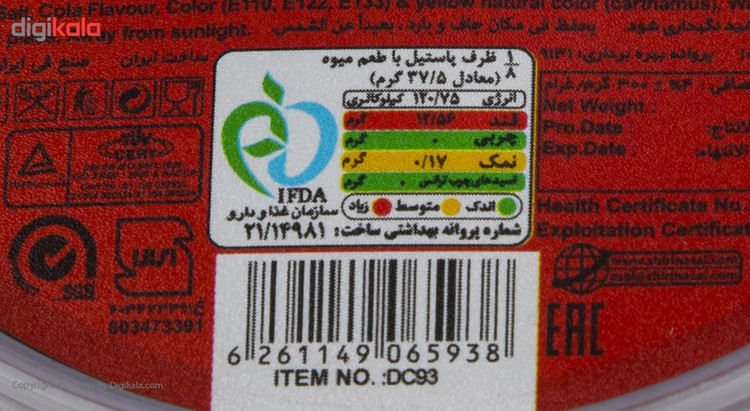 ارزش غذایی در 37/5 گرم: - انرژی 120/75 کیلوکالری - قند 12/56 گرم - نمک 0/07 گرم - فاقد چربی و اسیدهای چرب ترانس